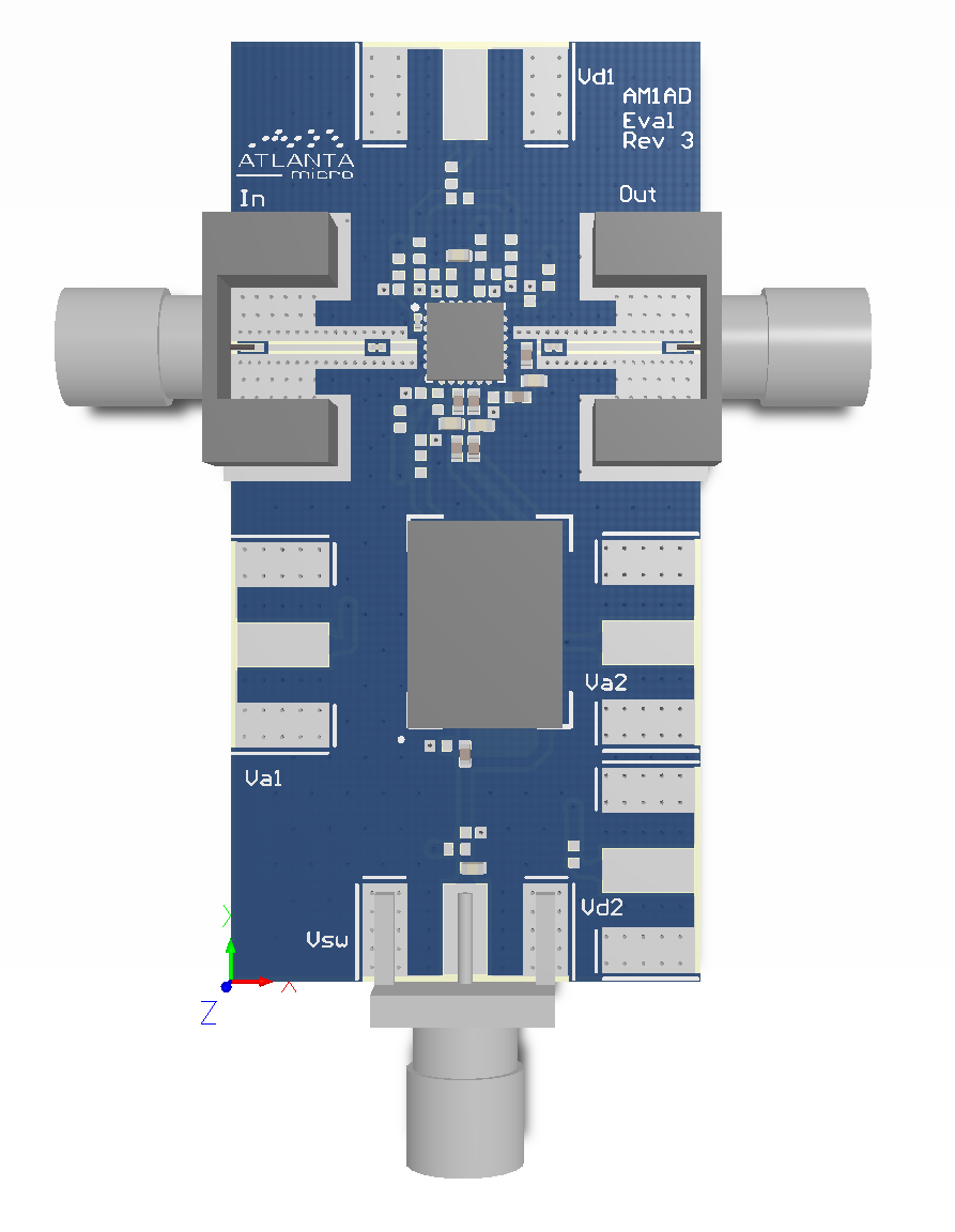 Evaluation board includes SMA input and output connectors and SMA voltage input unless otherwise requested. AM1065 evaluation board also includes DIP switch for control of bypass function. This switch is included with the evaluation board unless otherwise requested. Evaluation board includes AM1065. Module includes field replaceable SMA input and output connectors. Module also includes three pins for voltage input through a feed-through capacitor and a corresponding ground connection as well as a pin for toggling the bypass control high or low. Module includes four mounting holes sized 4-40 that are threaded from the bottom side of the module.